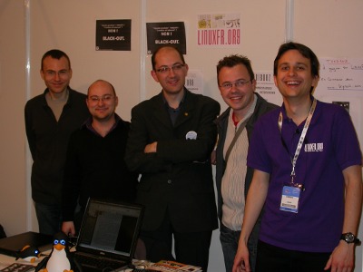 Le salon s'est terminé par une vente aux enchères au profit de la Quadrature du Net. Sur le stand LinuxFr.org, c'est mmenal qui nous a rejoint aujourd'hui. Quelques personnes sont venues nous parler de la (les) publication(s) judiciaire(s) (voir la dépêche Publication judiciaire) ou du concours libre en cours sur LinuxFr.org.