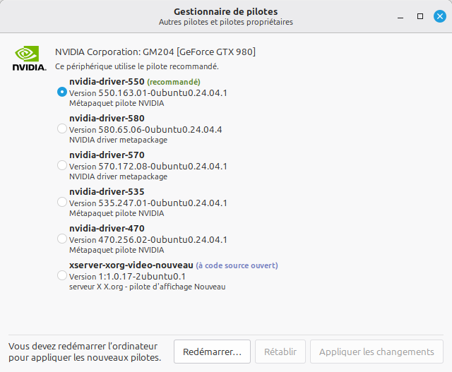 As tu le secure boot activé sur ce portable ? J'ai récemment fait des test de Linux Mint 22.2 sur un PC avec une GTX 980: lors de l'install le secure boot était désactivé et j'ai utilisé le gestionnaire de pilotes de Mint (nimage) qui m'a indiqué quelle version du driver installer.
